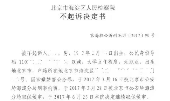 2017年10月19日 一、基本案情 2017年3月15日11时许,被不起诉人驾驶摩托车经过本市、海淀区安宁庄西路与朱房路交汇路口时,被民警依法排查,拒不配合,并欲强行逃离现场,后被民警制服,民警右手遭受外伤,经鉴定为轻伤。因此,被不起诉人涉嫌妨害公务罪被刑事拘留。 后委托李晓东律师、刘宇飞律师担任其辩护人。 被不起诉人被抓获后,如实供述犯罪事实,同时取得了受伤民警的谅解。