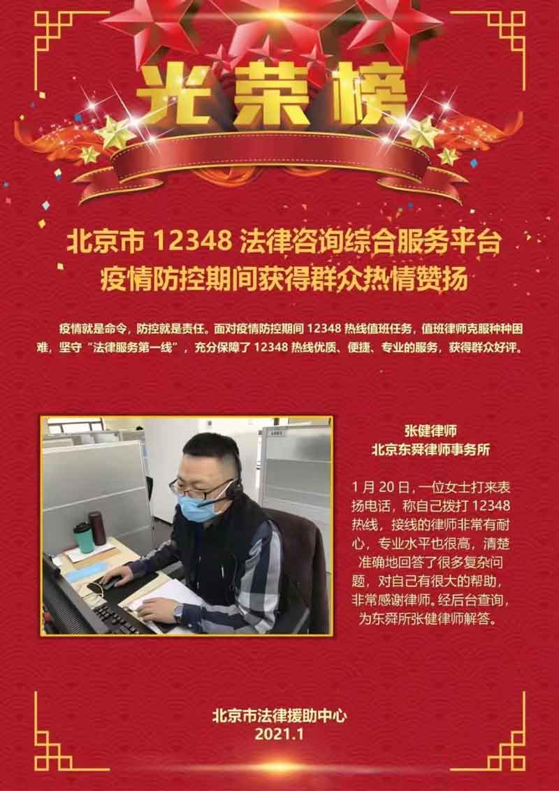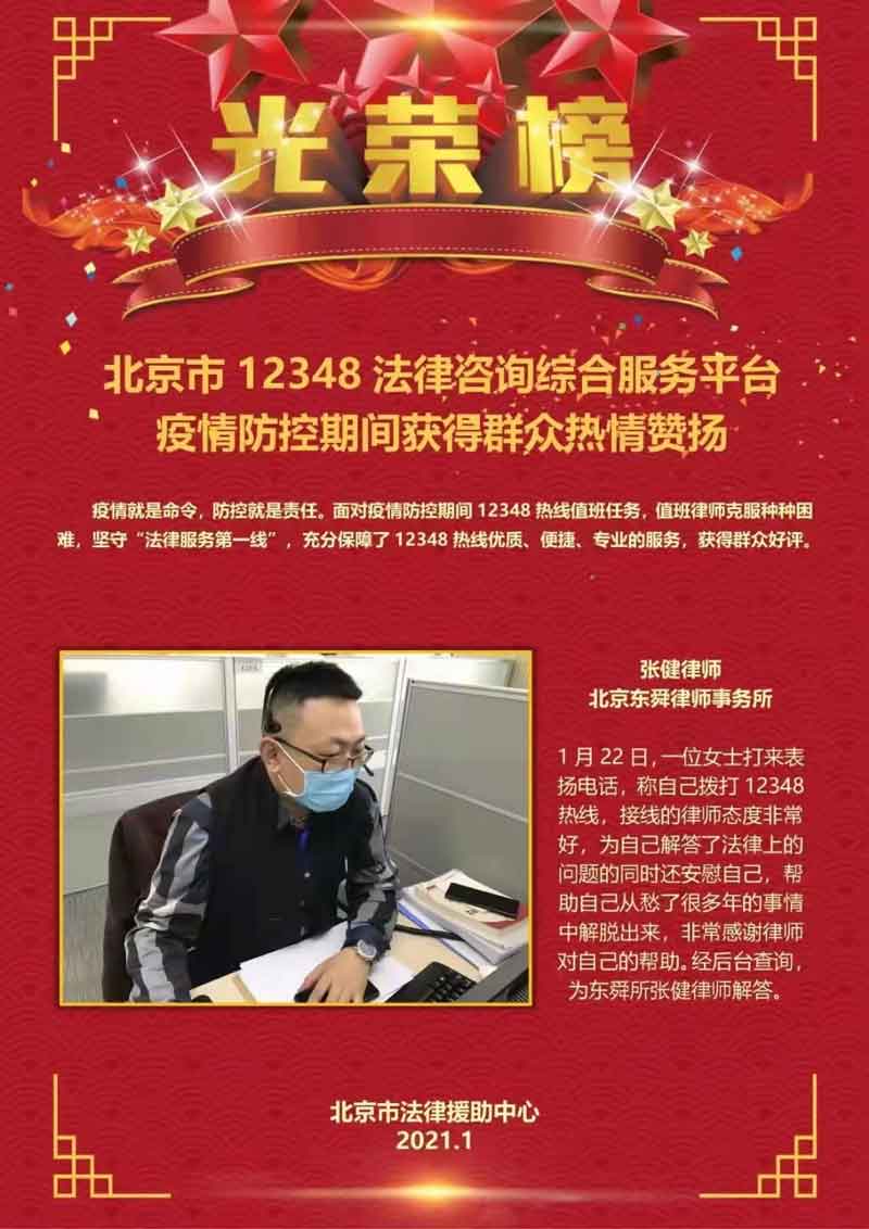 1月22日,一位女士打来表扬电话,称自己拨打12348热线,接线的律师态度非常好,为自己解答了法律上的问题同时还安慰了自己,帮助其从烦扰自己很多年的事情中解脱出来,非常感谢律师对自己的帮助,经后台查询,该律师为东舜所张健律师所解答。