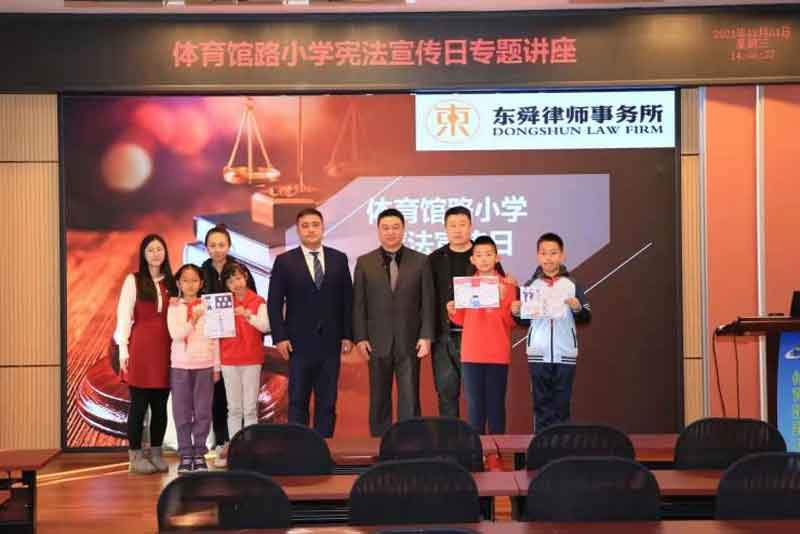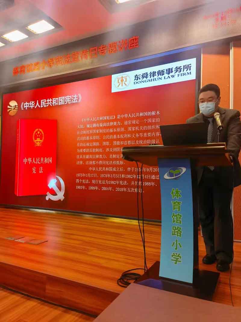 2021年12月1日,北京东舜律师事务所李晓东主任与钟宣律师为东城区体育馆路小学进行《宪法》宣传日主题讲座,李晓东主任、钟宣律师受聘为体育馆路小学法制副校长。