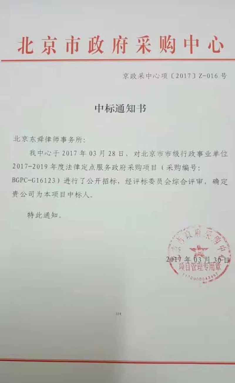 2017328日,北京市政府采购中心对北京市级行政事业单位20172019年度法律定点服务采购项目进行了公开招标。