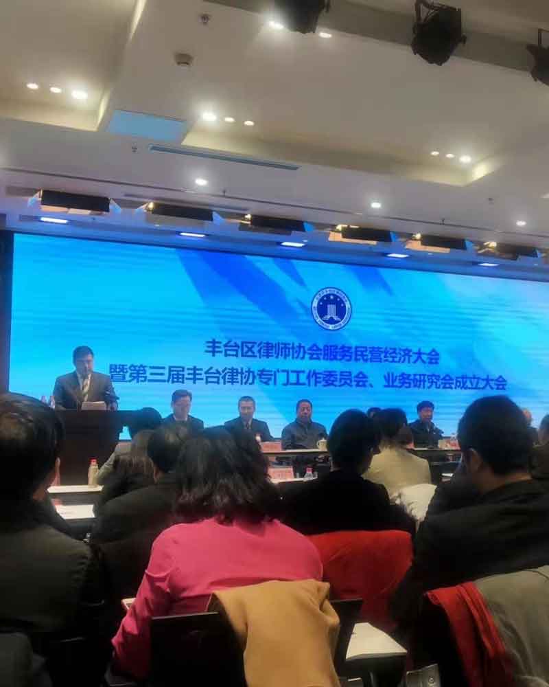 2018年12月23日上午,北京市丰台区律协换届后******次大会成功召开,本次会议主题为“丰台区律师协会服务民营经济动员暨第三届丰台律协专门工作委员会、业务研究会成立大会”。